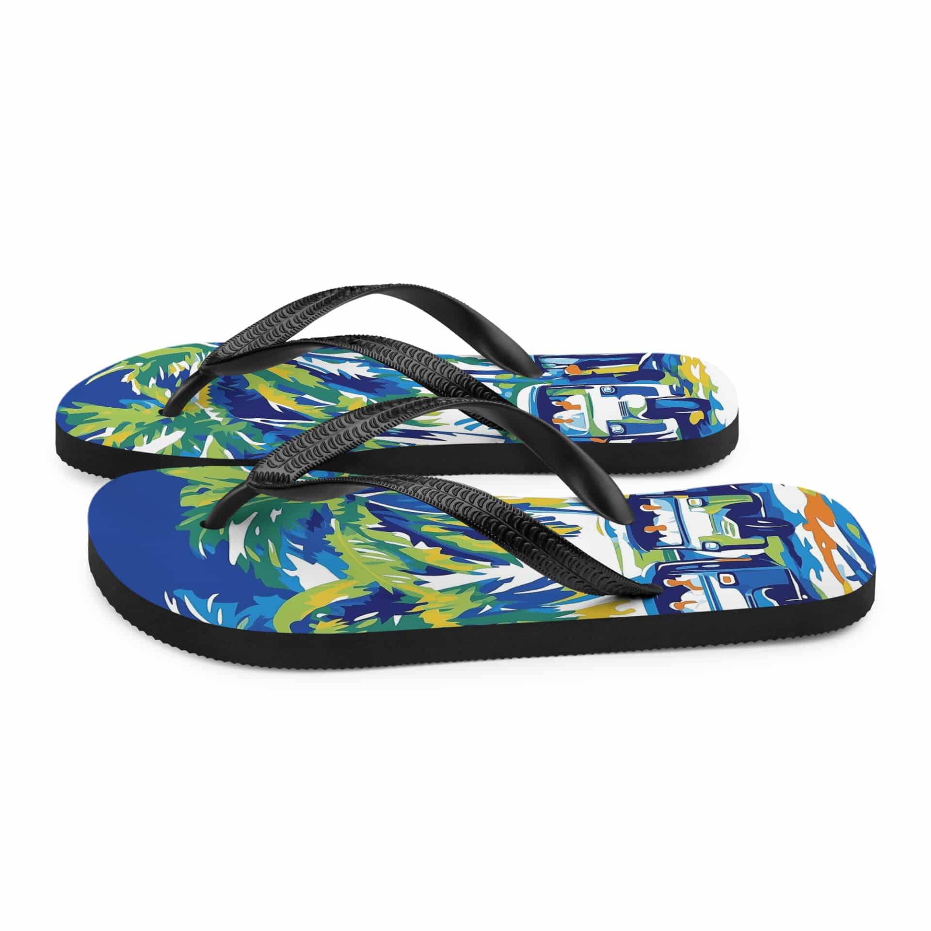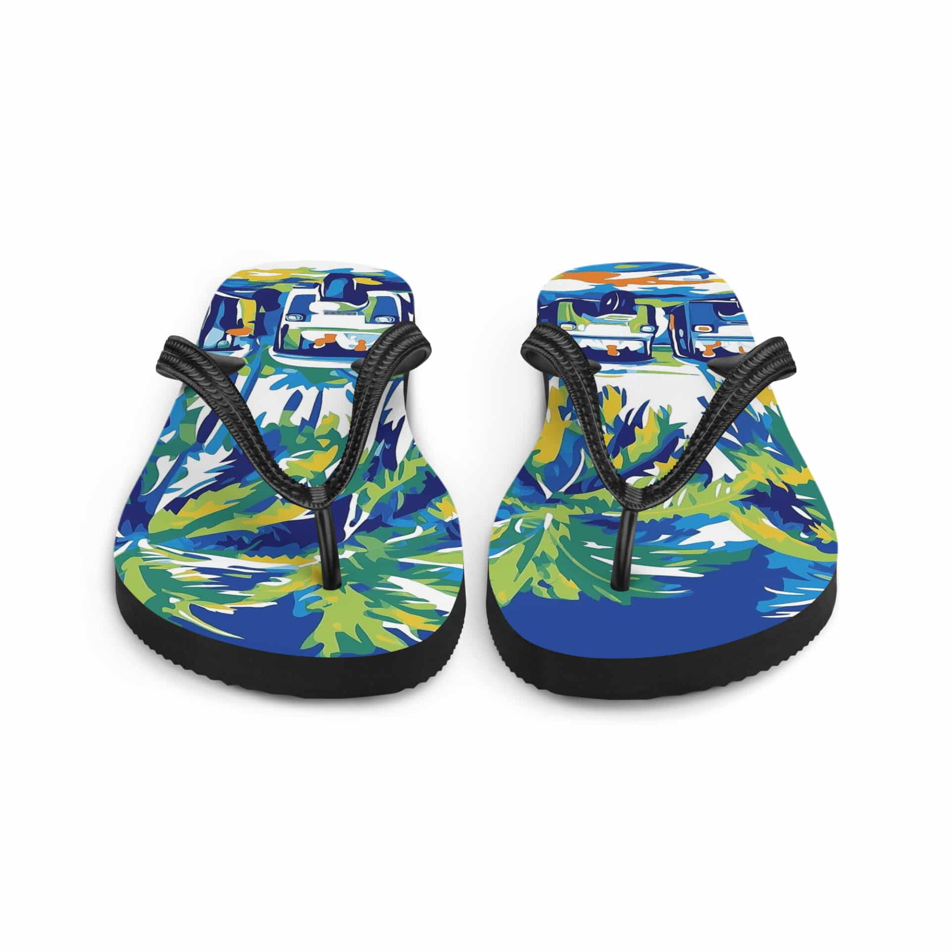 Stylish Sri Lankan merch featuring tuk-tuk designs on comfortable flip-flops