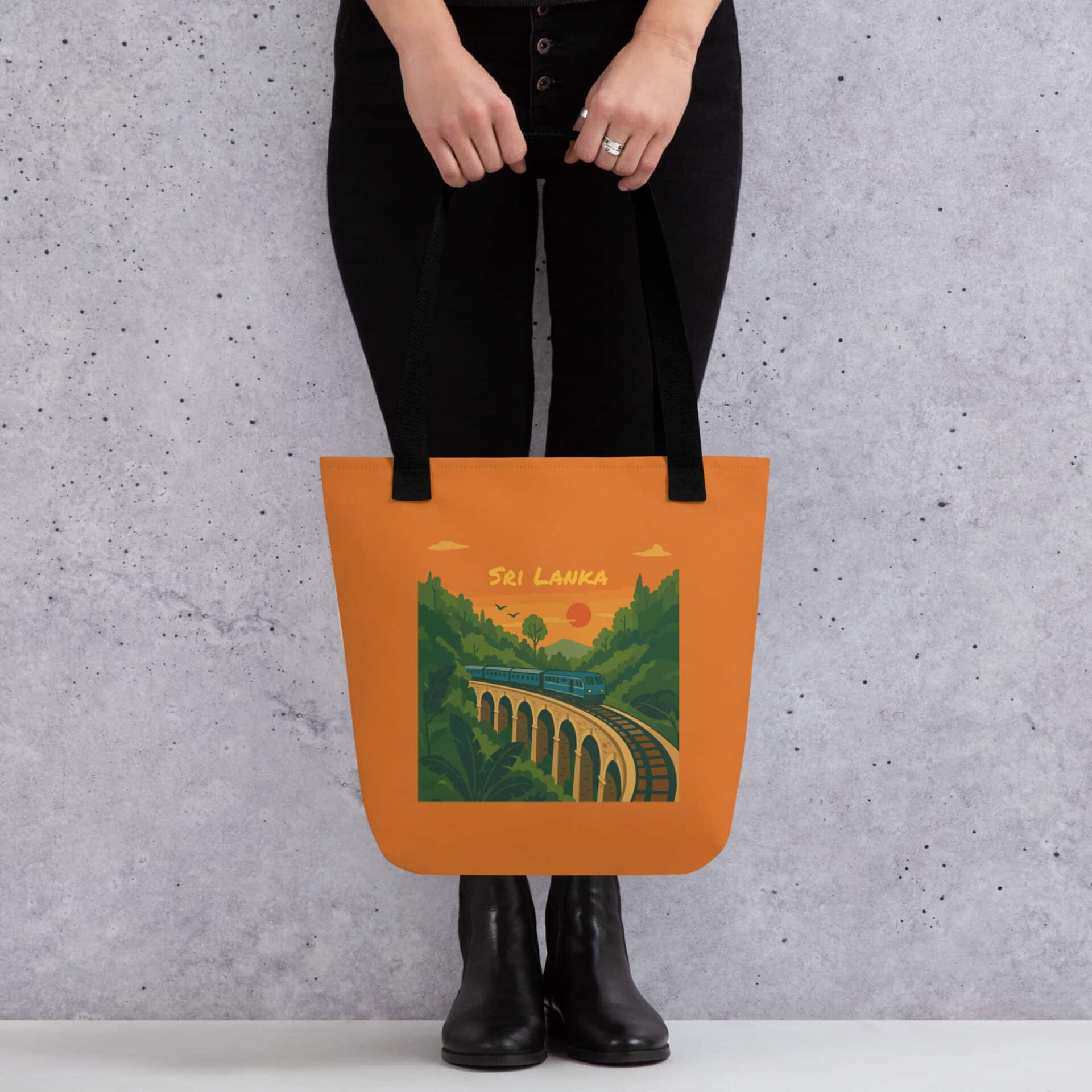A stylish person carrying the Nine Arches Whistle Tote Bag, an example of premium Sri Lankan Merch.